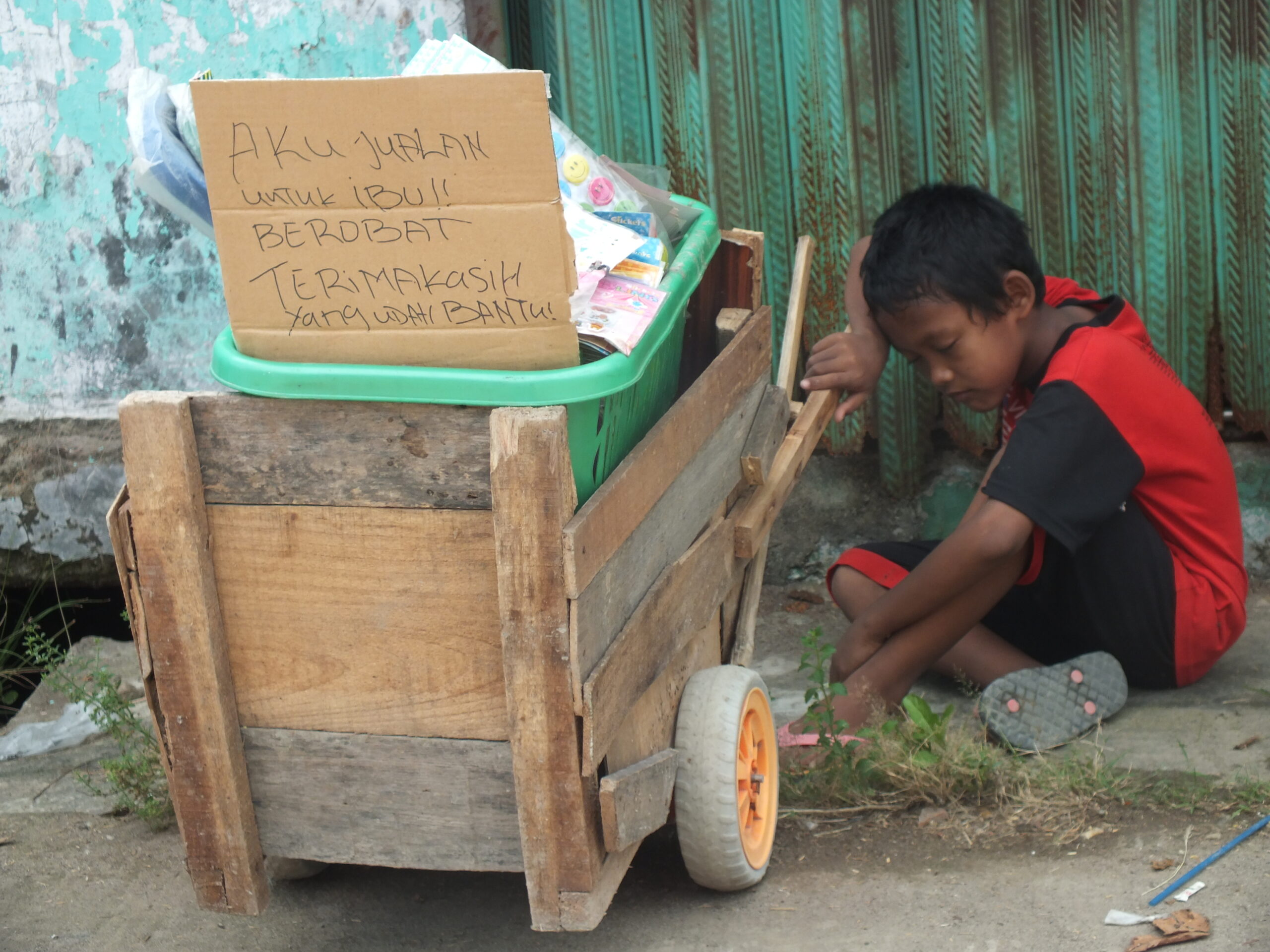 "Ibu badannya penuh darah dan nanah, aku jualan buat beli kapas sama tisu.. Kasihan Ibu nangis terus di rumah," isak Agus (11th). Bocah ini terekam kamera sedang menangis di seberang jalan, memandangi gerobak mainannya yang seharian sepi pembeli meski hari sudah mulai gelap.
