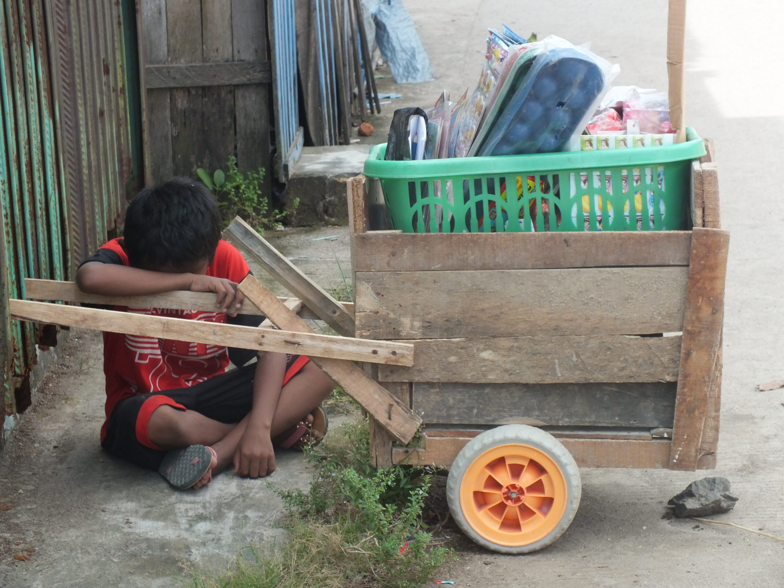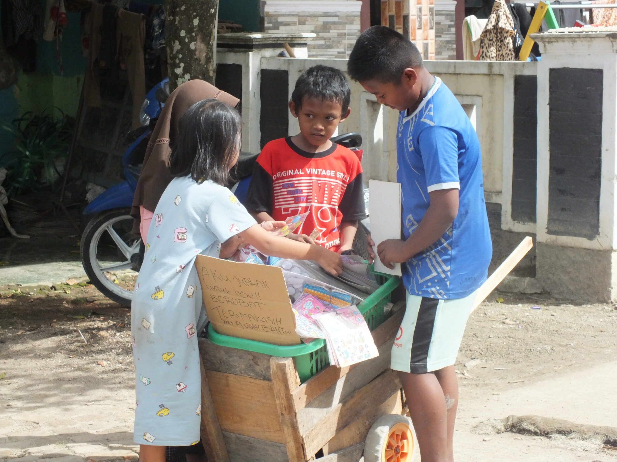 Sepulang sekolah, Agus tak langsung bermain. Ia mendorong gerobak kecil, berjalan kaki dari gang ke gang menjajakan mainan milik orang lain. Dari setiap mainan yang terjual, Agus hanya mendapat upah Rp1.000.